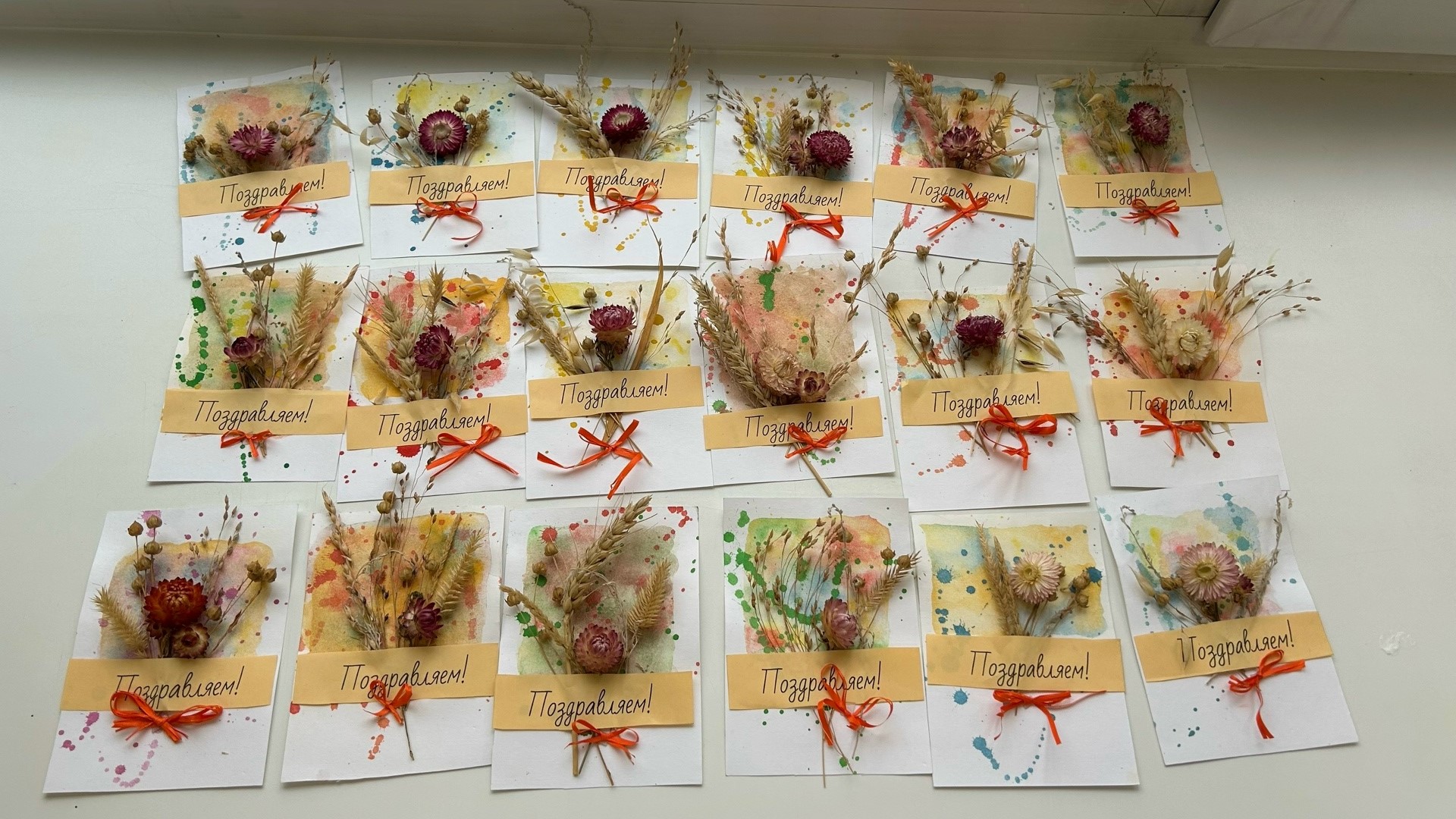Волонтёры отряда «Добротворцы» подготовили поздравления и подарили участникам авторские открытки, украшенные природным декором — сухоцветами и злаками. Эти работы стали символом благодарности и уважения к труду земледельцев, бережного отношения к природе и любви к своему делу.