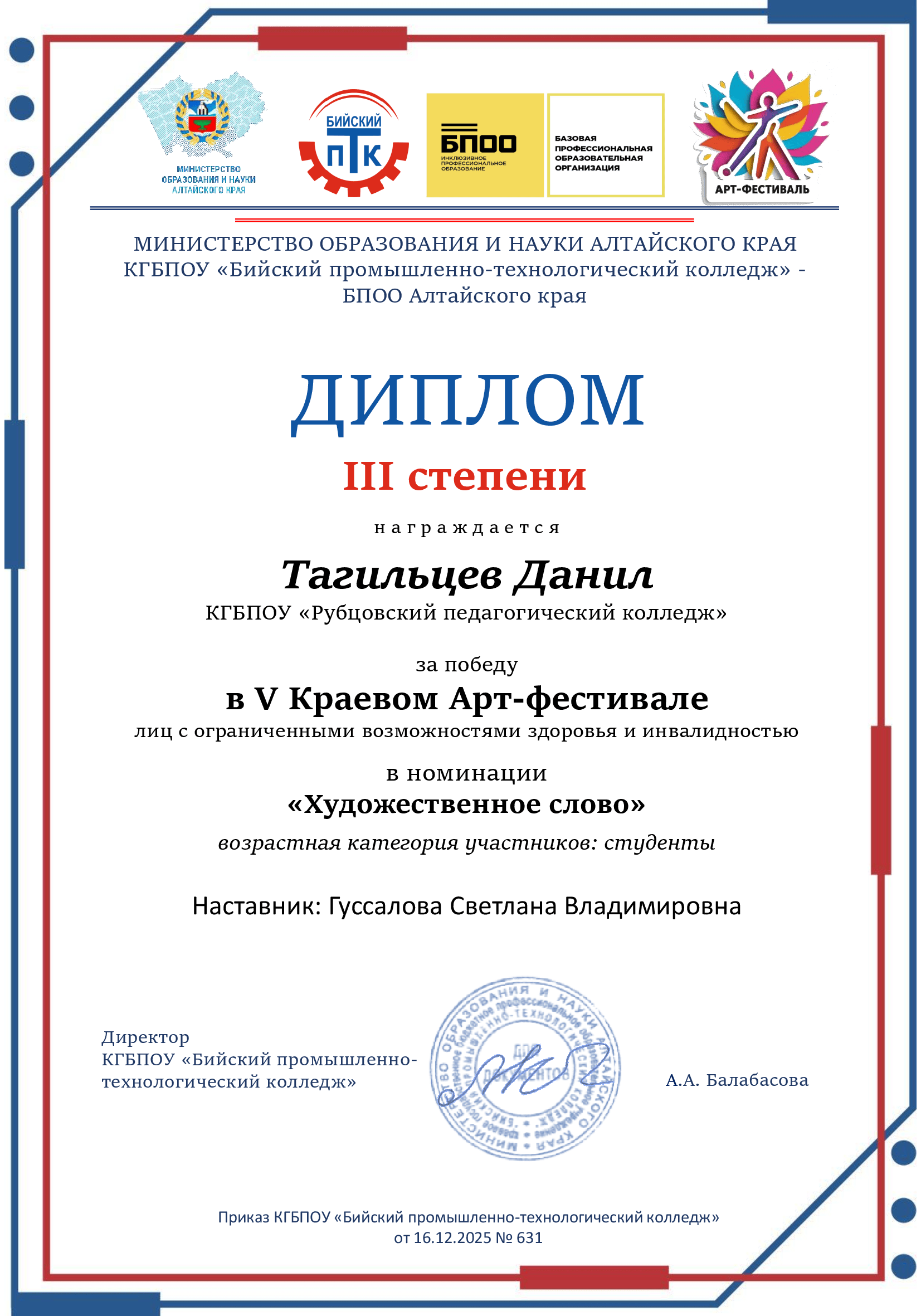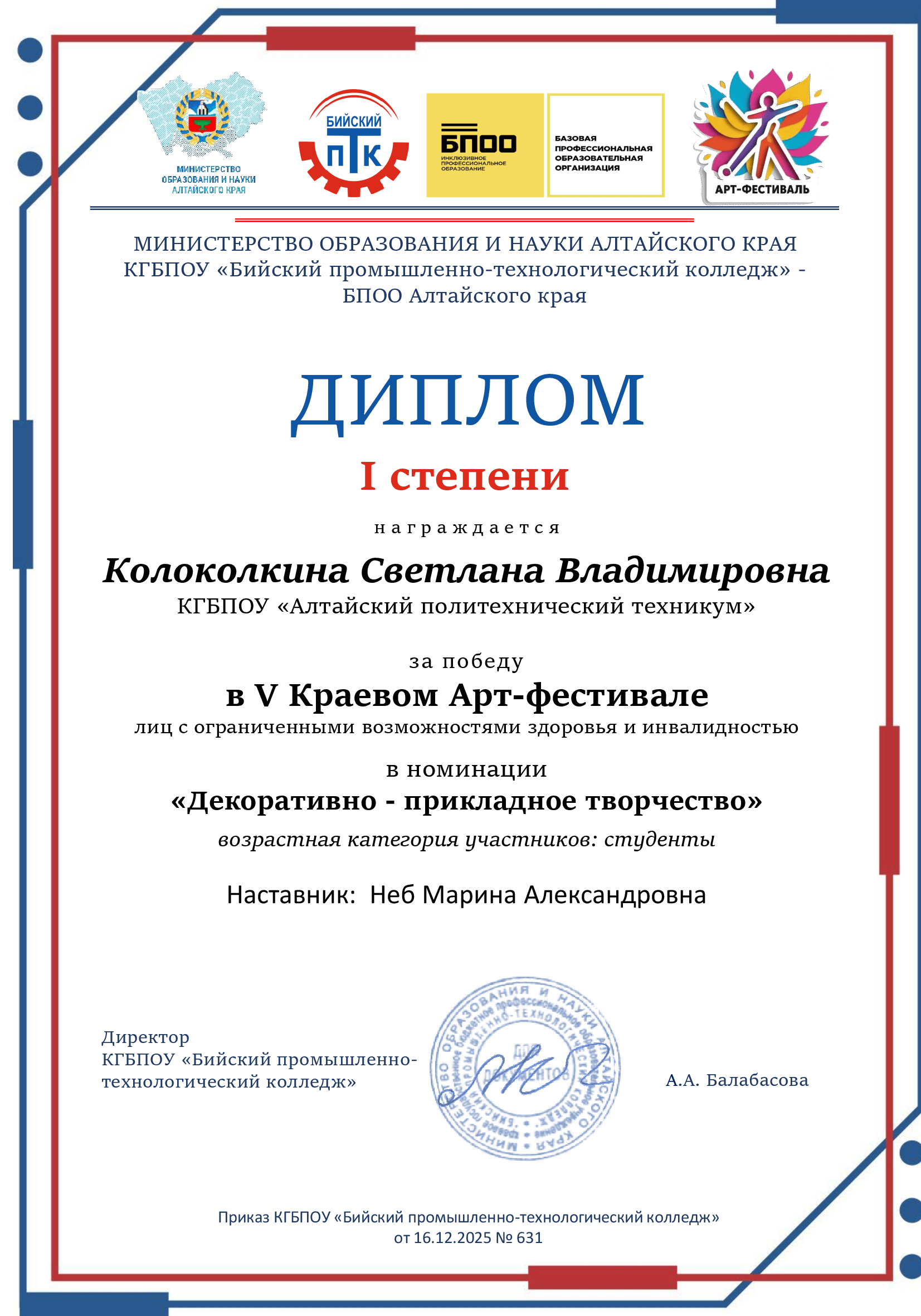 Для любого человека важно реализовать потенциал, раскрыть свои таланты, получить признание. Именно таким событием для лиц с ограниченными возможностями здоровья и инвалидностью стал V краевой Арт-фестиваль, организованный в конце января Бийским промышленно-технологическим колледжем с целью содействия средствами культуры и искусства процессу реабилитации и социальной адаптации, развитию художественного творчества обучающихся.