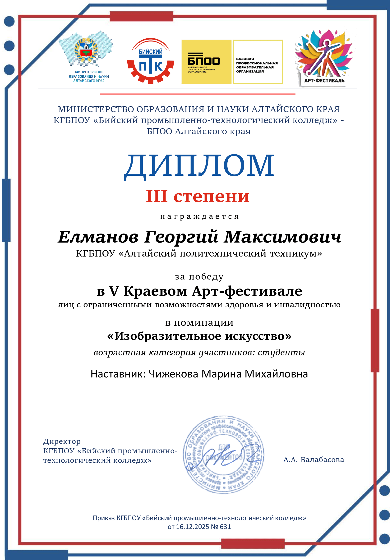 • В номинации «Изобразительное искусство» отличился Елманов Георгий, также удостоенный диплома 3 степени. Его работы стали ярким свидетельством творческого видения и умения передавать эмоции через краски и формы.