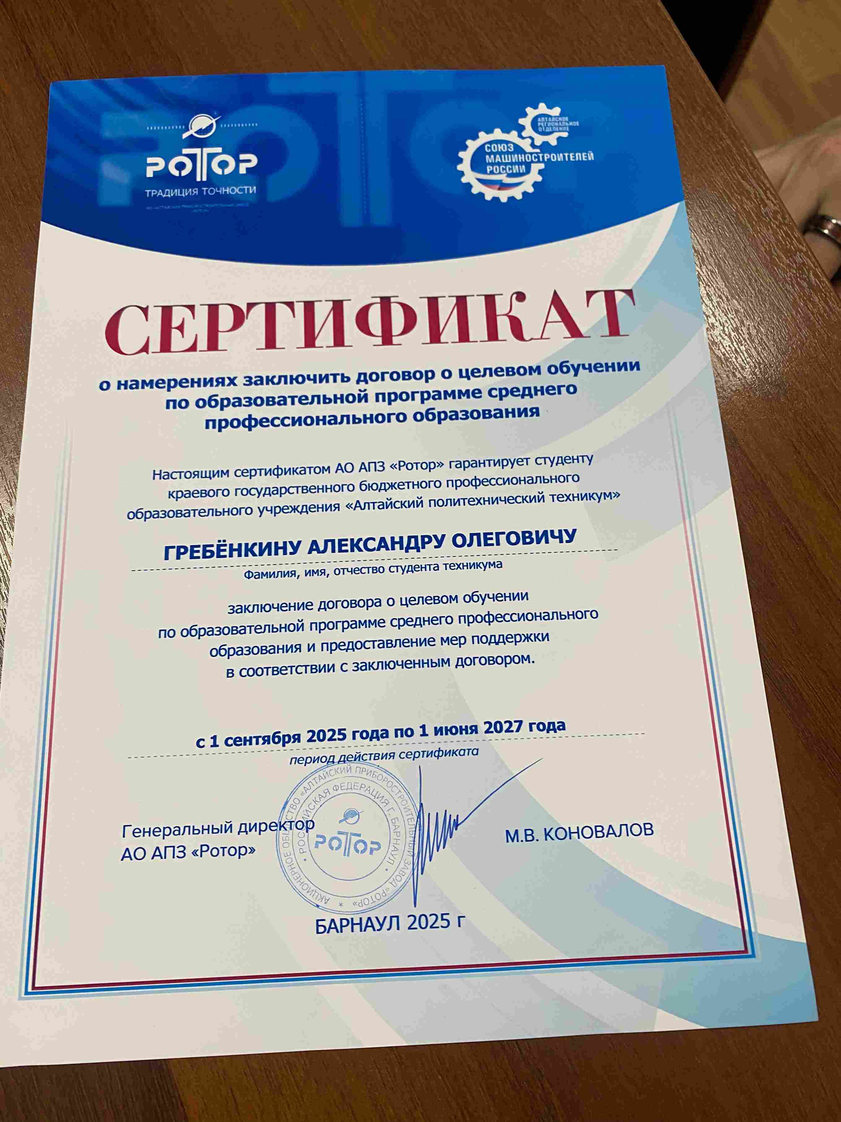 Когда мой папа объяснил, что такое целевой договор, я не понимал его суть и зачем он нужен. Но при вручении сертификата от завода РОТОР о намеренном заключении целевого договора, я ощутил важность что мое целевое обучение мой билет в будущее. Стремясь хорошо учиться как по теории так и по практике я хотел оправдать этот сертификат и сказать самому себе, что я смогу, если захочу. Я рад что мне одобрили целевое обучение, ведь теперь после учёбы я уже смогу работать и пробовать себя во взрослой жизни.