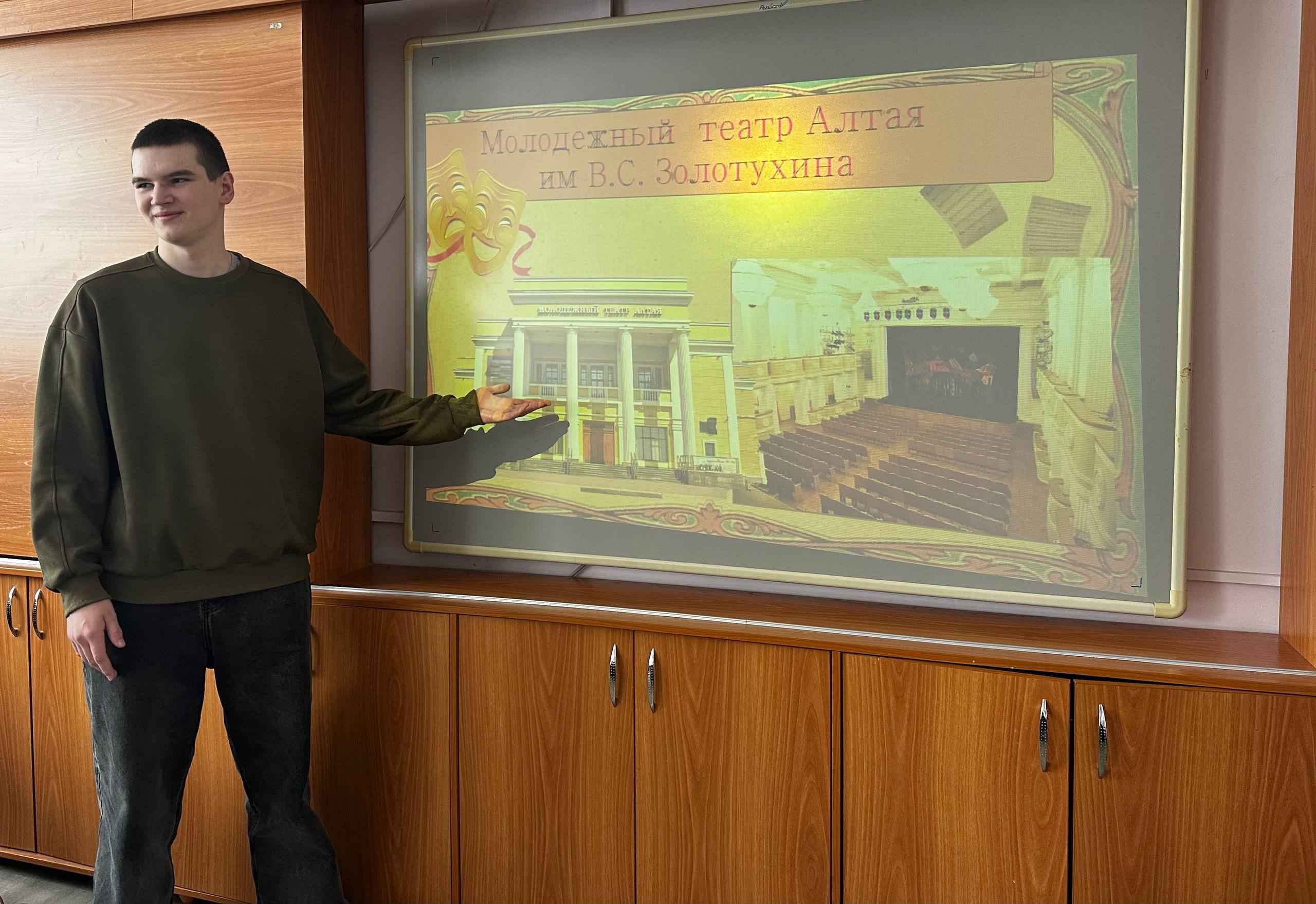 Информационные беседы с презентациями о театрах Барнаула. На 1 отделении их провели активисты студкома при поддержке советника директора по воспитанию Сарнацкой Л. С., на 2 — сами театралы, а на 3 — старшекурсники во главе с Шахторовой А. В.