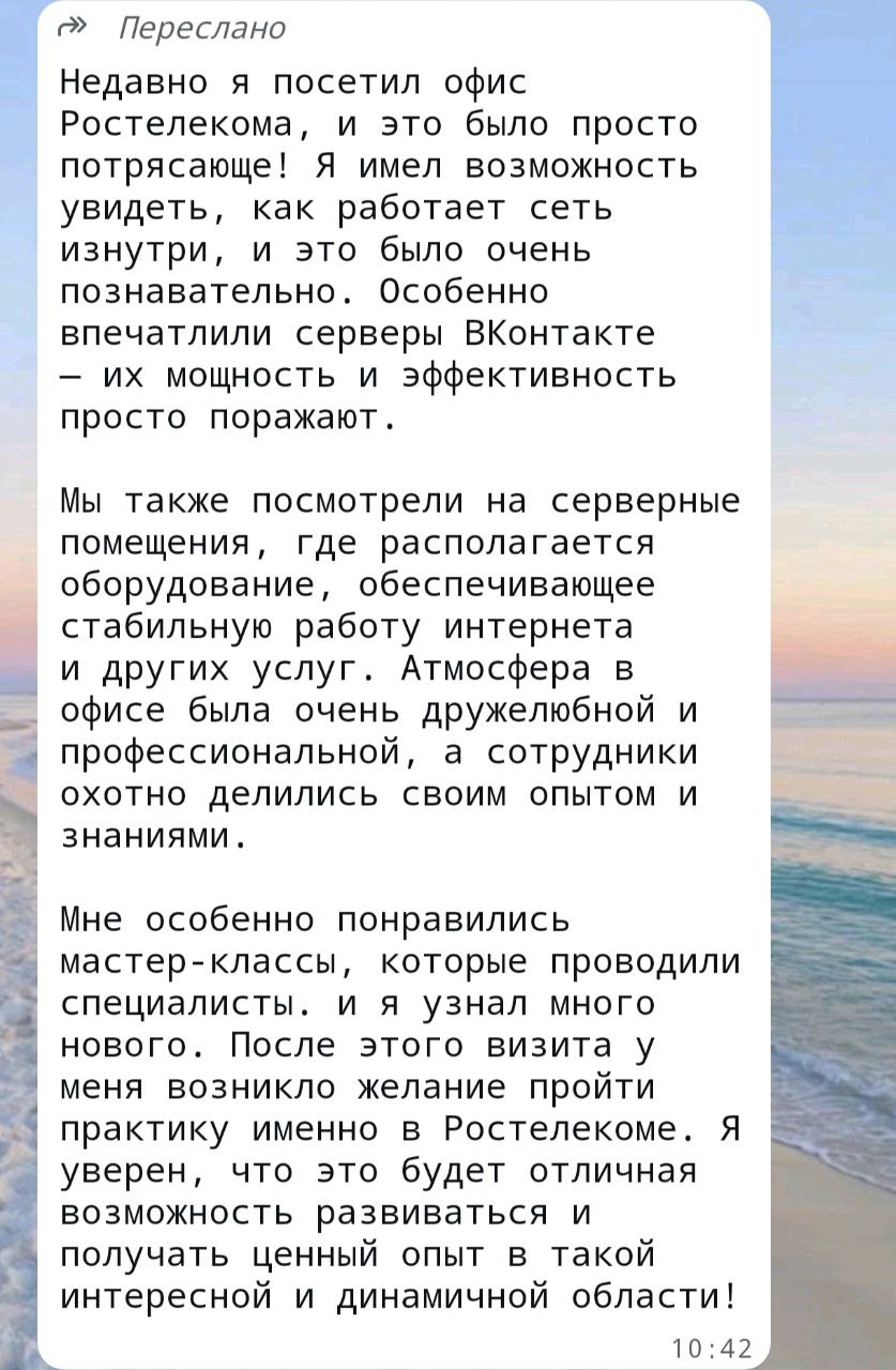 Встреча оказалась очень полезной для студентов. Они увидели, как работает крупная телекоммуникационная компания: узнали, какие системы обеспечивают бесперебойную работу телеком-оборудования, что сварка, например, бывает не только большим сварочным аппаратом, но и практически карманным. Для них такая экскурсия — возможность познакомиться с будущим рабочим местом и возможностью дальнейшего трудоустройства. Начальник станционного цеха Алтайского филиала «Ростелекома» Александр Васильев провел студентов по серверной, которую в компании называют «сердцем» алтайской связи. В ней размещено технологическое оборудование, которое обслуживает каналы связи всего региона. Ведущий инженер центра эксплуатации филиала Алексей Жуков продемонстрировал участникам встречи кропотливый процесс сварки оптики.