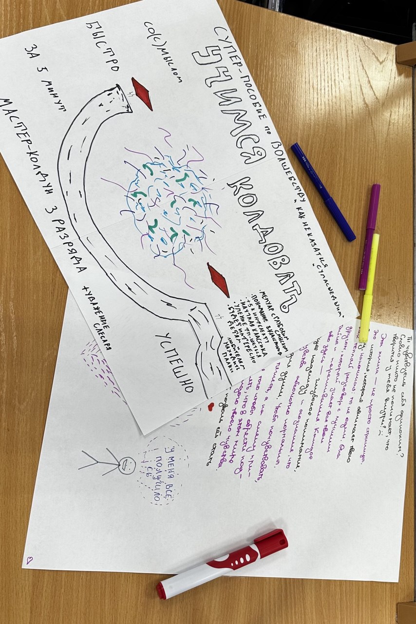 Чтобы идеи не остались только в словах, перешли к практике: как заинтересовать чтением тех, кто не читает книги? В ходе деловой игры «Книжный фреш-маркет» команды превратились в «книжные бренды» и создали рекламу книги — такую, чтобы сверстникам захотелось открыть ее и прочитать. Кто-то вдохновлял, кто-то креативил, кто-то сделал почти готовый промо-ролик. Несколько презентаций действительно убедили: книгу стоит взять.