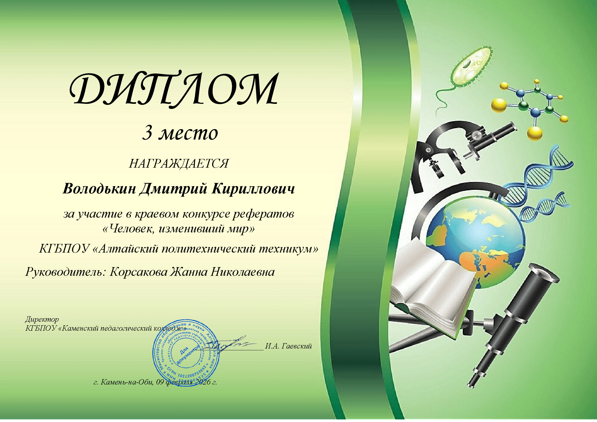 Один из таких конкурсов, краевой конкурс рефератов «Человек, изменивший мир», собрал более 80 авторов из 18 учебных заведений края. Среди них был и Дмитрий Володькин, обучающийся группы ТМ-251. Его работа, посвящённая нашему земляку Виктору Фёдоровичу Галазину, внесшему значительный вклад в развитие российской навигационной системы ГЛОНАСС, получила высокую оценку жюри. Дмитрий был удостоен диплома 3 степени.