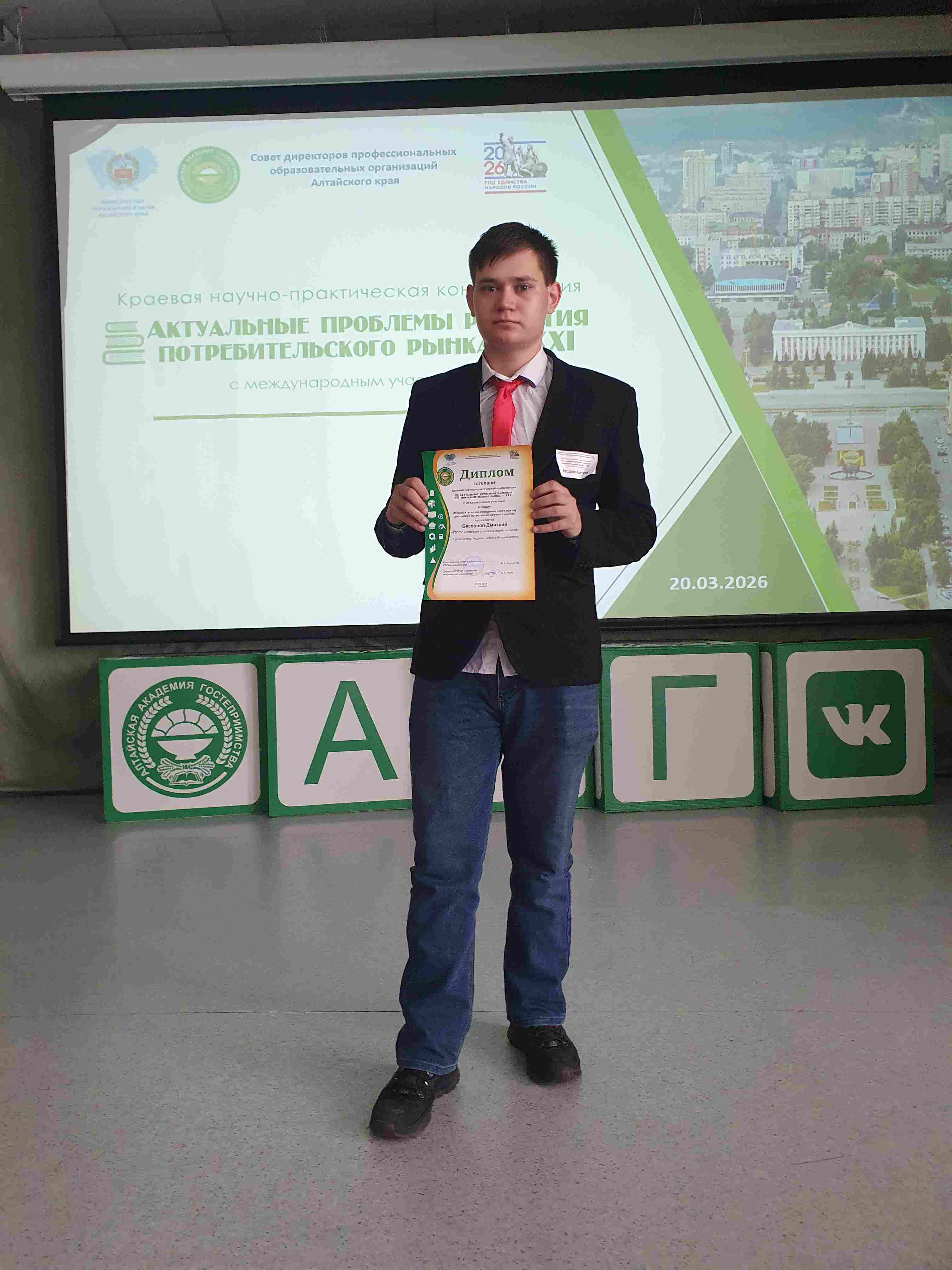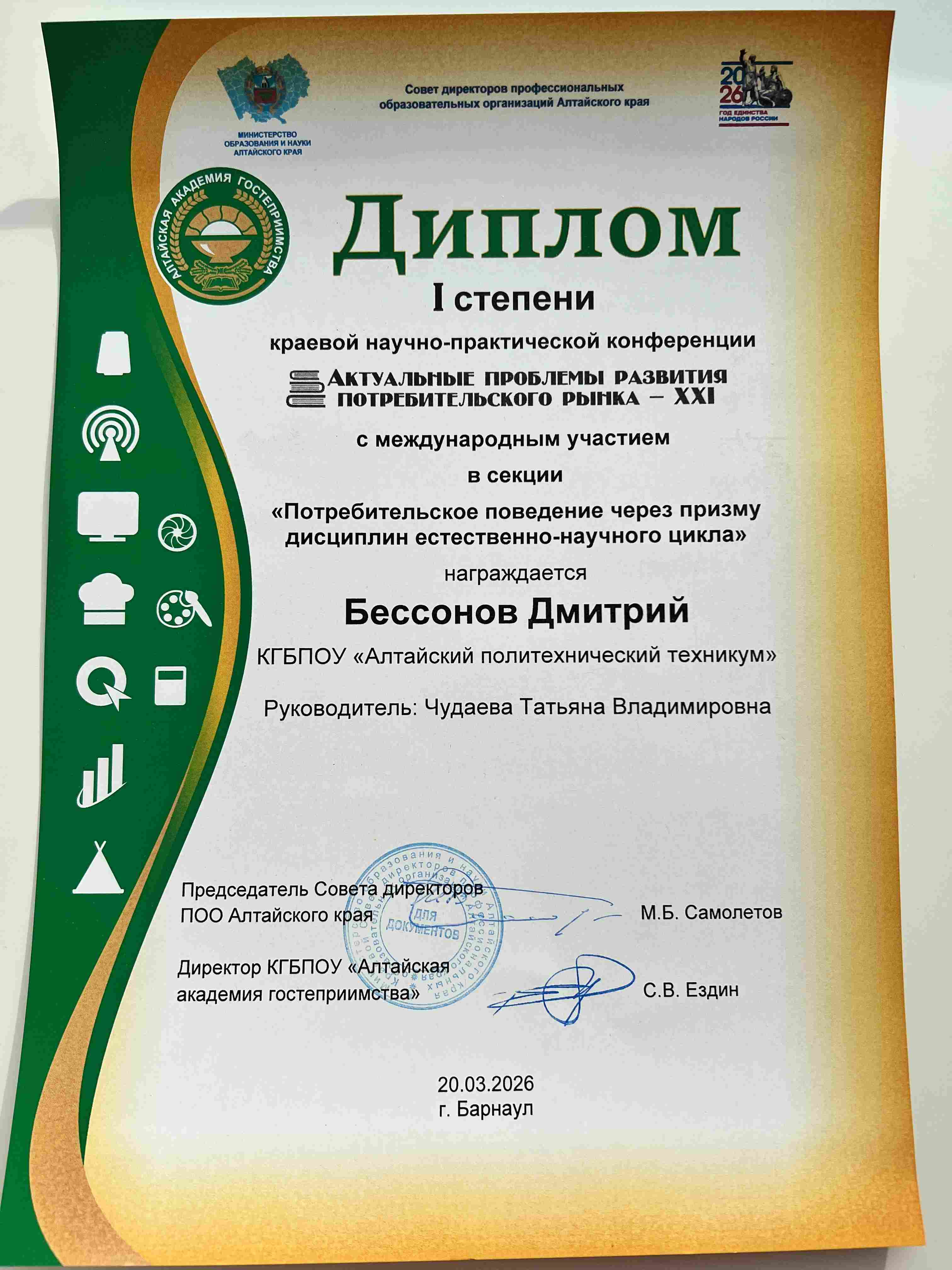 В секции «Потребительское поведение через призму дисциплин естественно-научного цикла и математики» принял участие Бессонов Дмитрий, обучающийся группы РЭУ-231 Алтайского политехнического техникума.